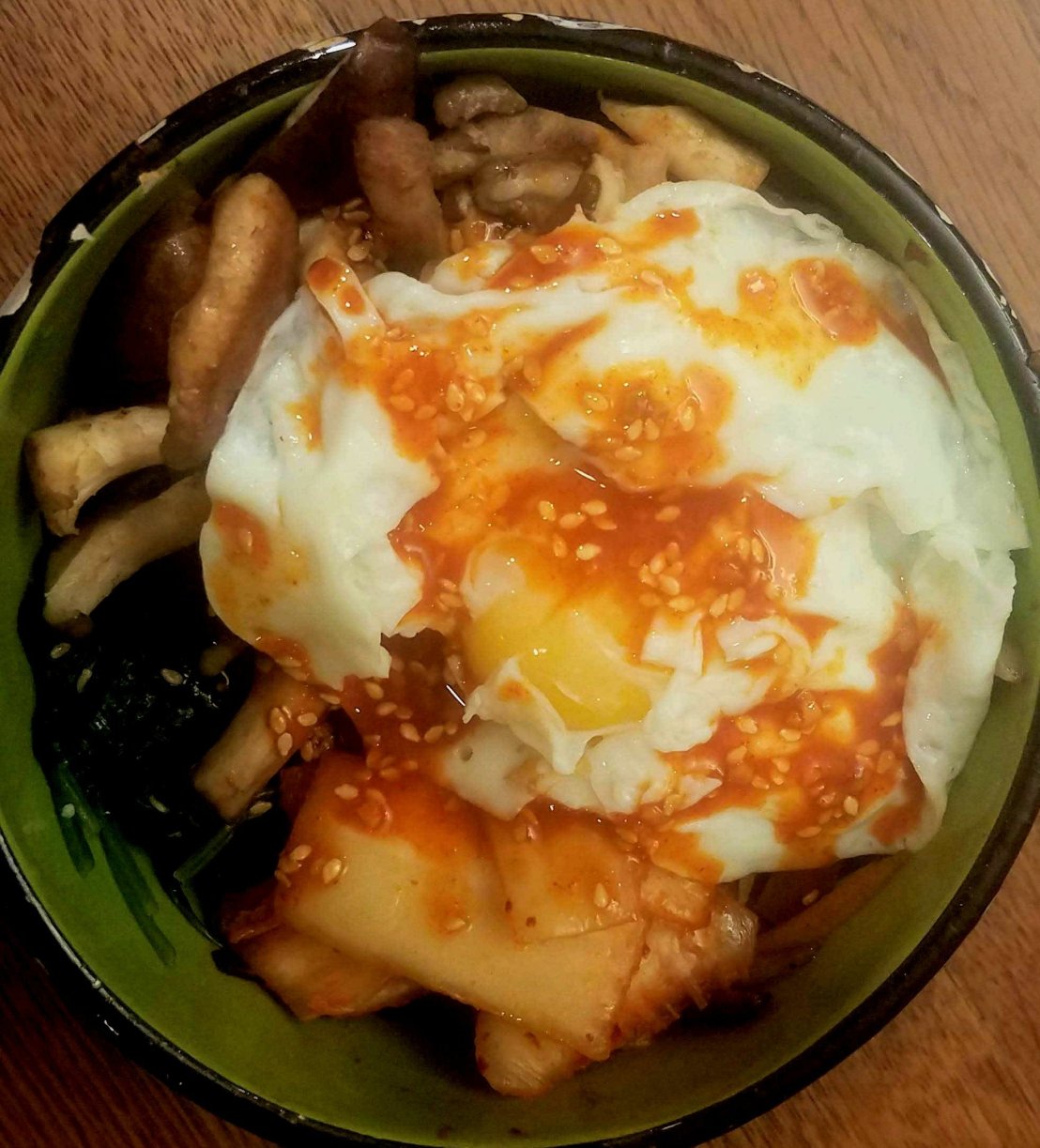 With the mandatory fried egg on top and drizzled with bibimbap sauce.