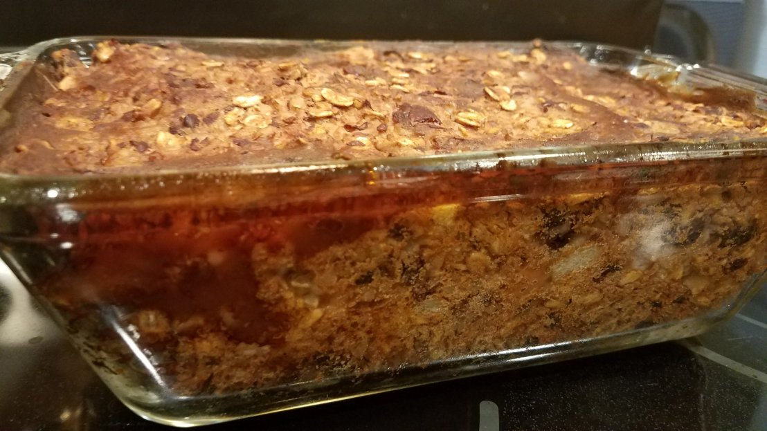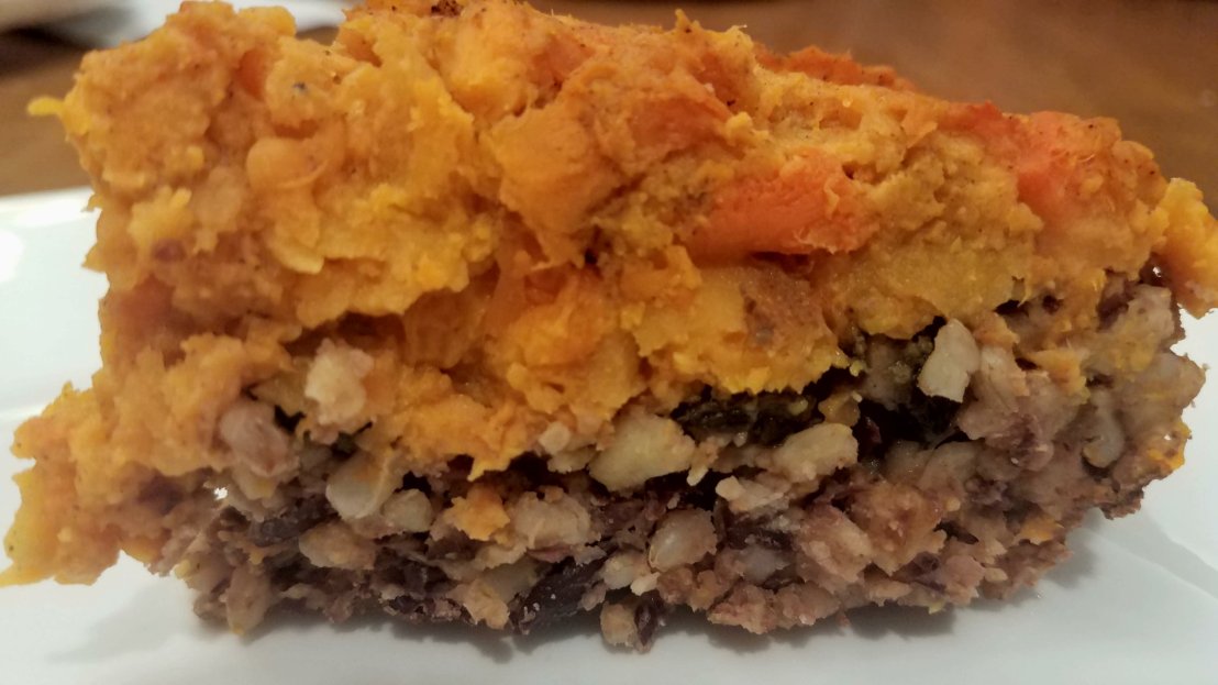 I crumbled up about 2/3 of the bean loaf and pressed it into the bottom of a pie dish. Then using 2 1/2 cups of the orange mash-up I spread it on top. I baked it at 375 degrees for 30 minutes. The sweetness of the sweet potatoes tasted great with the bean loaf. Super yummy!