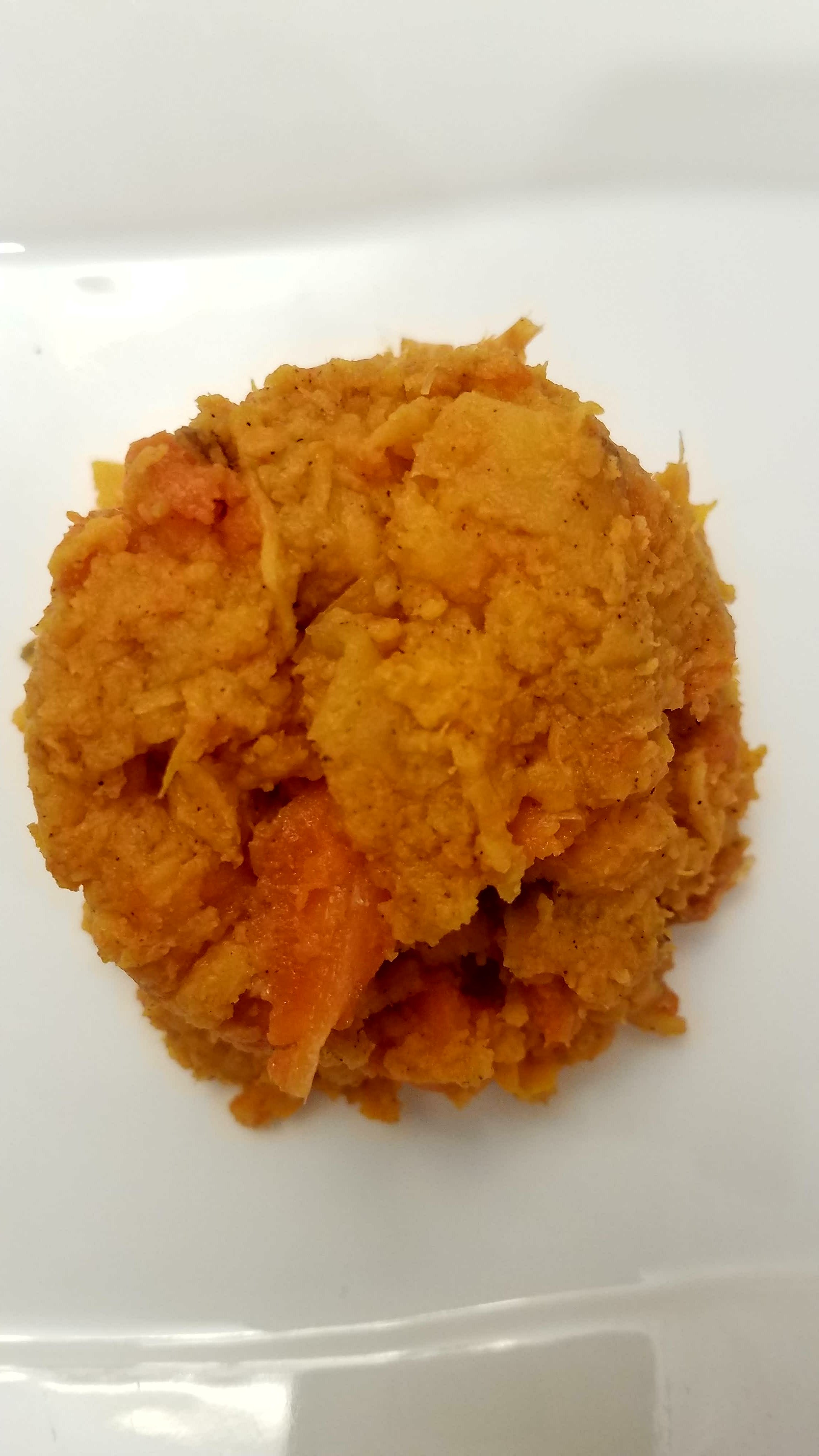 I crumbled up about 2/3 of the bean loaf and pressed it into the bottom of a pie dish. Then using 2 1/2 cups of the orange mash-up I spread it on top. I baked it at 375 degrees for 30 minutes. The sweetness of the sweet potatoes tasted great with the bean loaf. Super yummy!