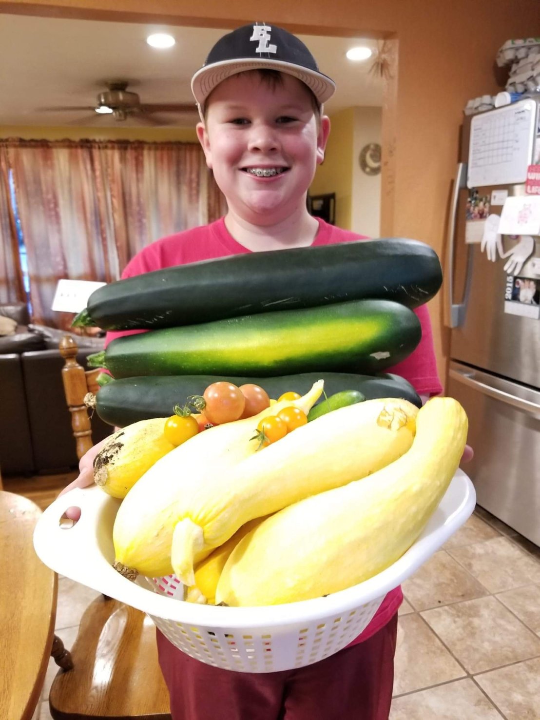 It’s that time of year when Google searches are at an all time high for zucchini recipes. I wanted to give equal love to my summer squash as well as my zucchini. Last night was zucchini, tonight is summer squash. And when you’re lucky enough to have a son who plants you a garden for Mother’s Day, the stakes, as well as the yield are high. ๐ Here is the proud boy with his bounty.