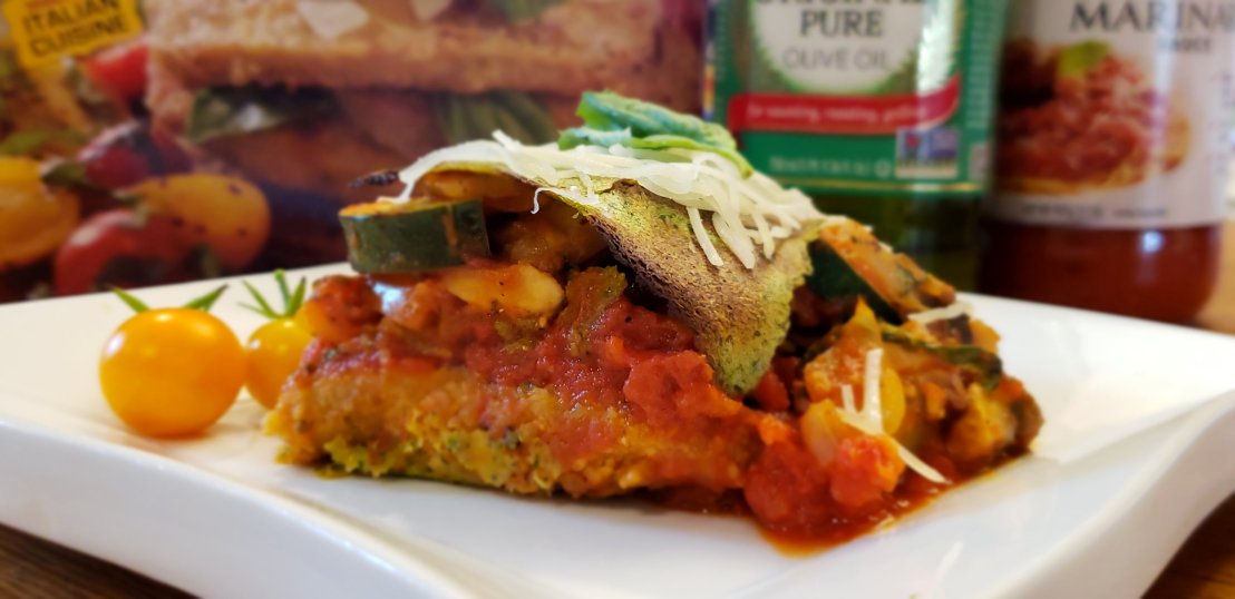 In a sprayed 8 1/2 x 11 casserole dish, layer zucchini sheets. 2 fit perfect. Then eggplant. Top with the vegi sauce and repeat. Dump the rest of the marinara sauce over the casserole. I ended with zucchini sheets on top.