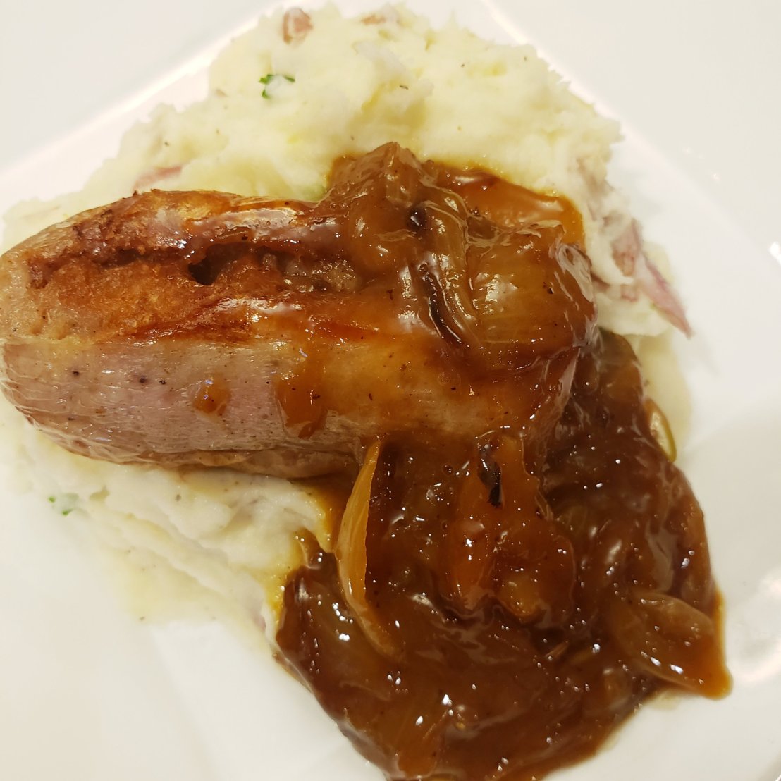 These sausages are plumper than what I typically buy and are traditionally served upon a fluffy pillow of mashed potatoes with onion gravy atop. This was the recipe I followed