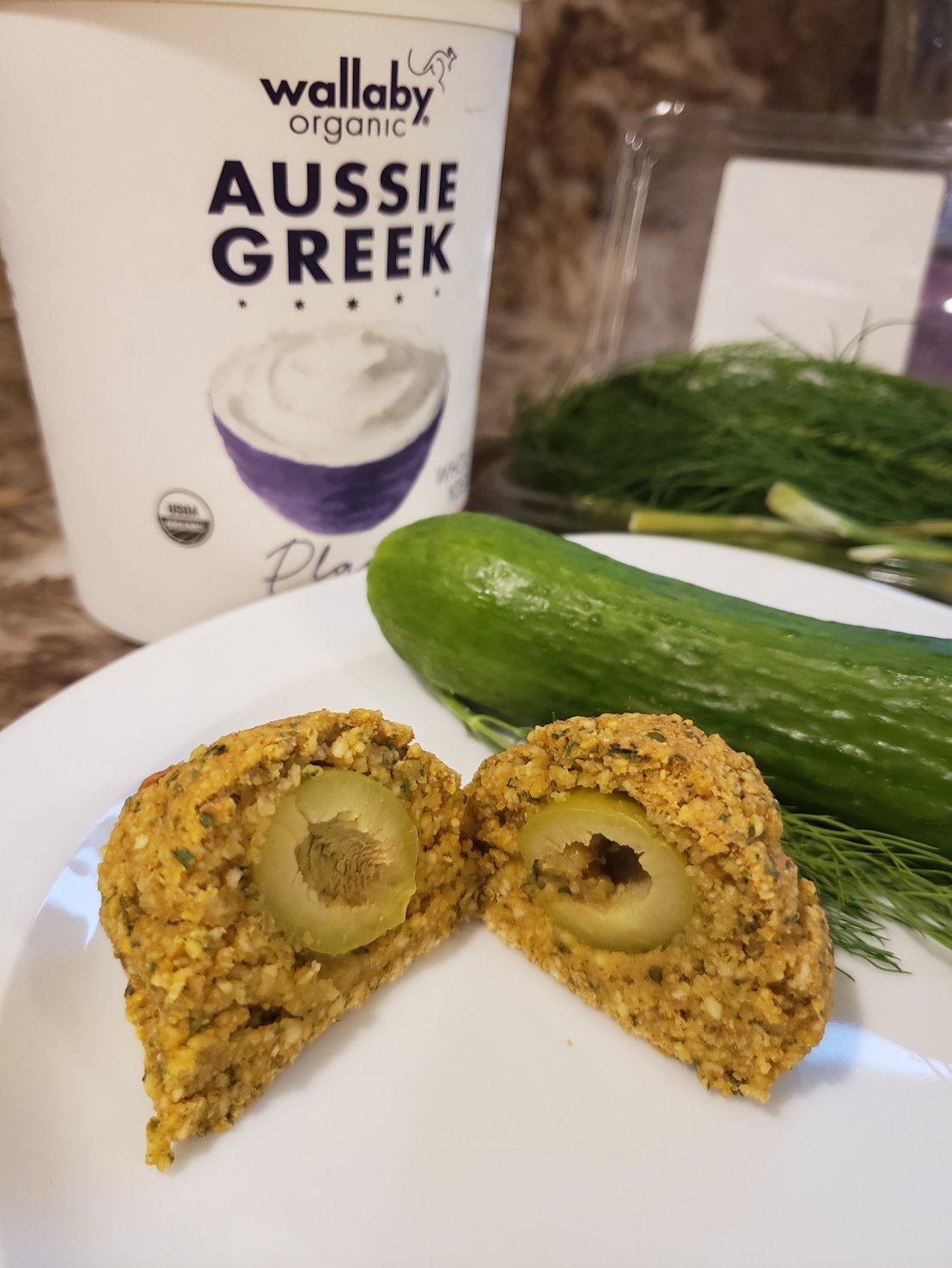 Just for funsies I saved 1 whole olive and wrapped the falafel mix around it. Kinda reminds me of a Scottish egg. Maybe I’m onto something…. a Mediterranean egg.