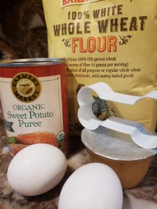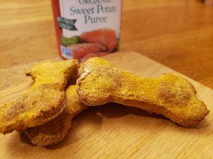 Sweet potatoes are high in fiber and beta carotene. They’re a popular and slightly healthier substitute to the regular potato with many cooking applications. Even with all the fancy recipes out there, my favorite way is just simply slicing them to roast with coconut oil. But, oh what fun it was to make these dog treats using canned, pureed sweet potatoes. I think when you know how much someone or some-dog will enjoy it, it adds so much more joy to the cooking process.