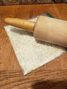 Place the bananas in a Ziploc bag and beat with a rolling pin. You could put them in a food processor, but as the waiter said in NOLA, that takes the heart and soul out of it. And when else can you just beat something with a rolling pin?
