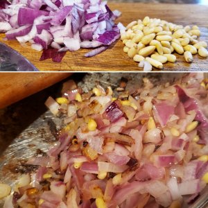 In a small skillet saute the onions and pine nuts in the olive oil until onions are translucent.