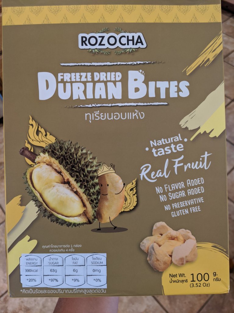 Obviously I couldn’t send you a fruit, through the USPS, that has a smell described as a cross between rotten onions, turpentine and raw sewage. Can you even imagine when that package arrived? “Ooooh that smell, Can’t you smell that smell.” Most people think in song lyrics right? But, I actually thought the lyrics were “the smell that’s all around you,” but it’s actually “the smell of death surrounds you” Well, I like mine better. Sorry Lynard Skynard. On the flip side, may be the fastest mail delivery to Alaska in history! Just to get it out of there! Instead I found freeze dried durian, conveniently wrapped in packaging.