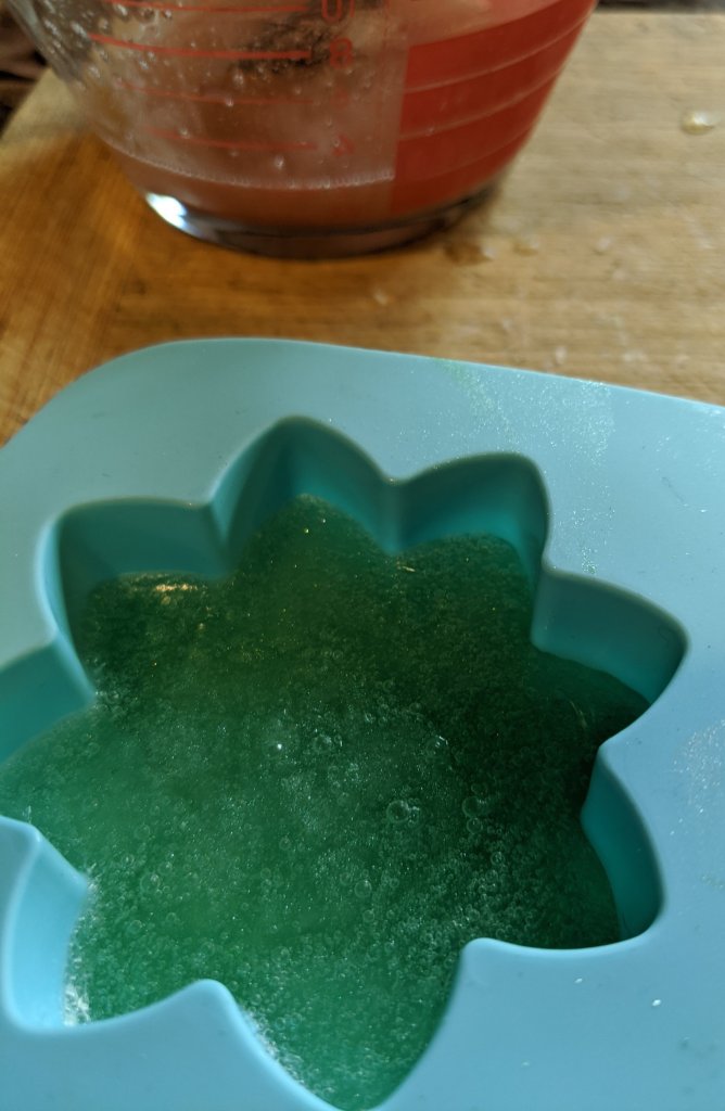 - Put one pile of soap into the glass measuring cup and mircrowave for 15 seconds, stir, then another 10-15 seconds until fully melted.