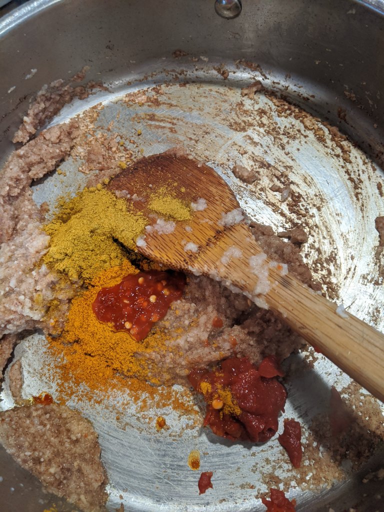 - Stir in chili paste, tomato paste, tumeric and curry*