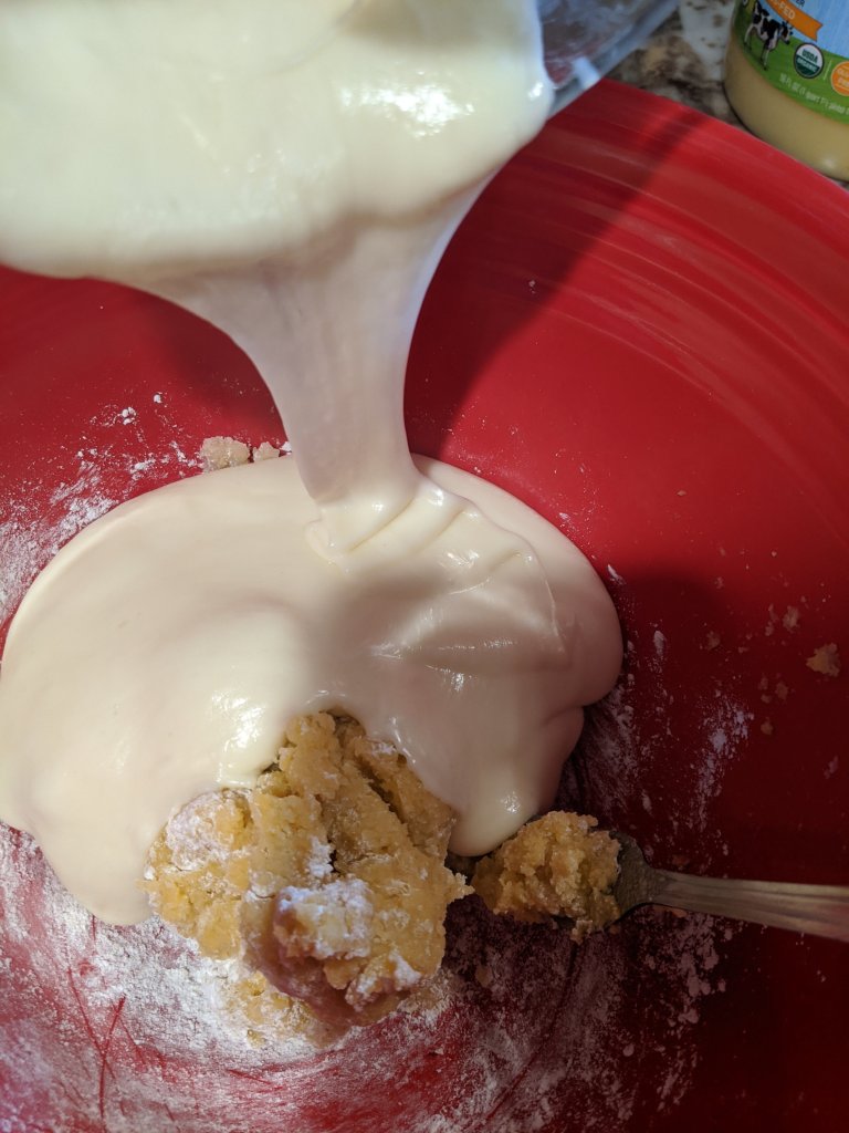 - Work quickly! While the cheese is still hot, combine the flour mixture with the cheese mixture. And just get in there, with your hands, and knead it until a uniform dough forms