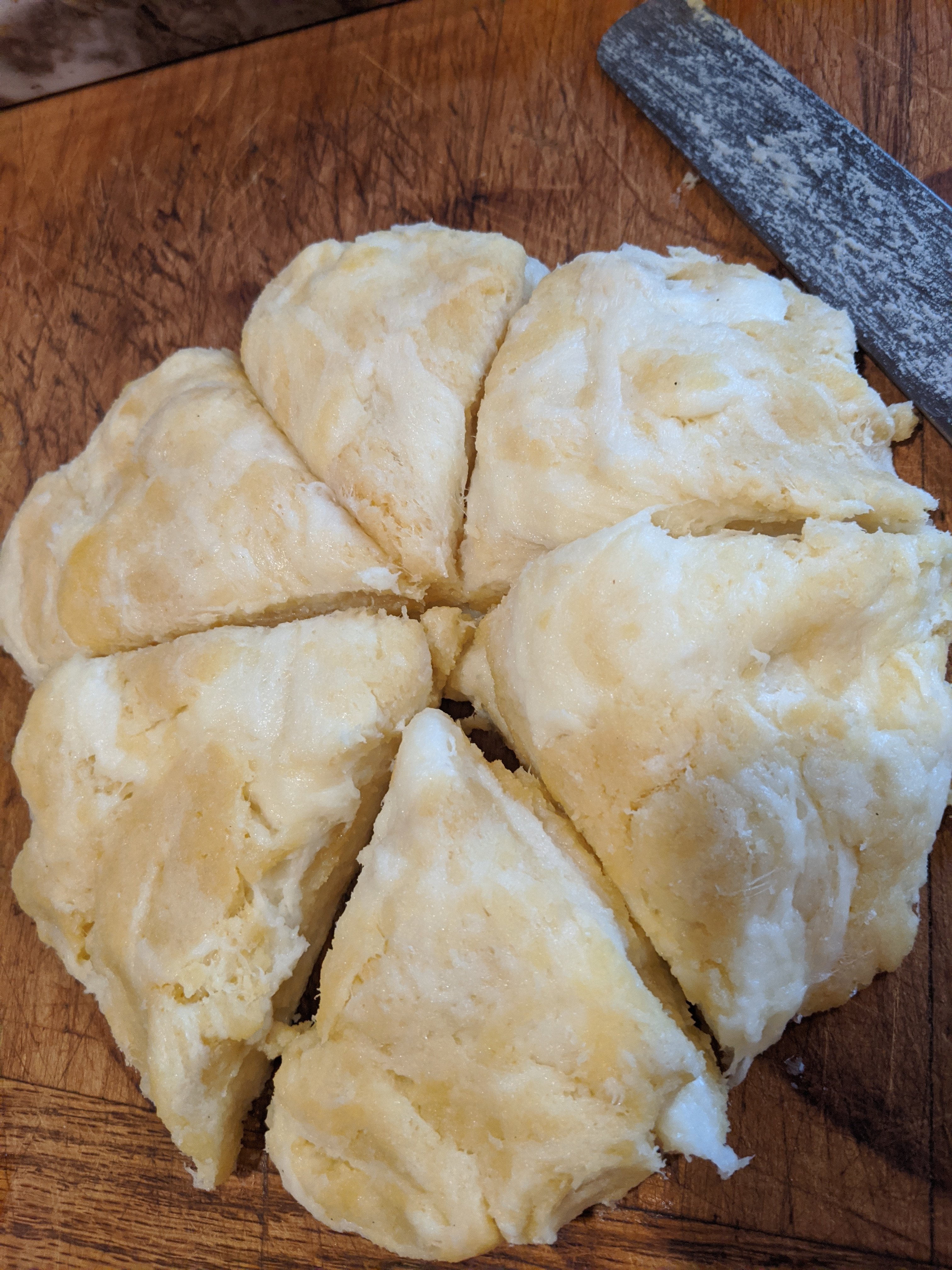 - Cut the dough into 6 sections, then roll each section into a ball and flatten into a a flatbread shape